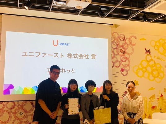 「ユニファースト賞」を受賞した「おかし屋ぱれっと・工房ぱれっと」チームと審査員を務めた当社開発本部長の花畑