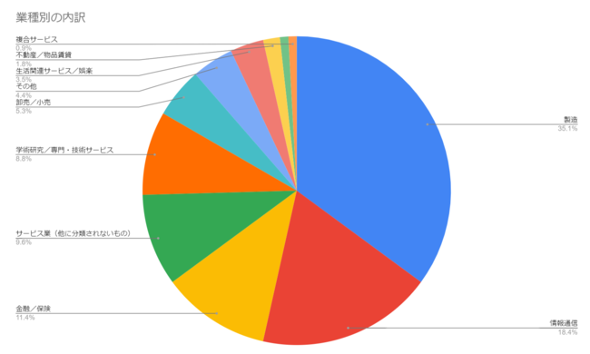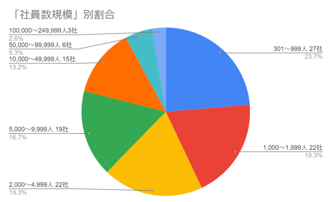 また、従業員数が1万人以上の企業は合計24社(21.1%:大企業114社中。以下同じ)、10万人以上ではソニー株式会社、株式会社ブリヂストン、本田技研工業株式会社の3社となりました。業界別では、製造業(25社:22.7%)と情報通信業(18社:16.4%)が約4割を占める他、金融業界(13社:11.8%)などが中心に賛同しています。社員数301名以上の大企業に分類される企業の業種内訳は以下になります。