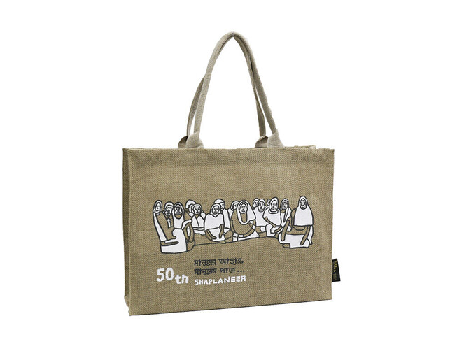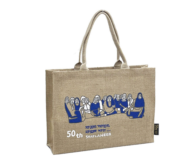 シャプラニールの理念にも通じる、50周年の想いを込めた「人々を信じ、人々と共に」を、バングラデシュの公用語ベンガル語で「マヌシェル アスタェ マヌシェル パシェ」とプリントしています。エイブルアート・カンパニーの作家、佐々木英明氏が今回のために特別に描き下ろしたイラストは、手書きならではの曲線で人々の優しい表情が描かれています。
