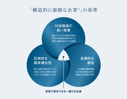 「売らなくていい企業しか買わない」を投資哲学とし、付加価値の高い産業、圧倒的な競争優位性、長期的な潮流の3つの要素を備えた「構造的に強靭な企業(R)」のみに厳選投資しています。本当に強い企業は、圧倒的な競争優位性を持っており、持続的に企業価値が増え続けます。そうした企業の株価は、タイムラグはあったとしても長期的には上がることが想定されるため、売買する必要がないのです。