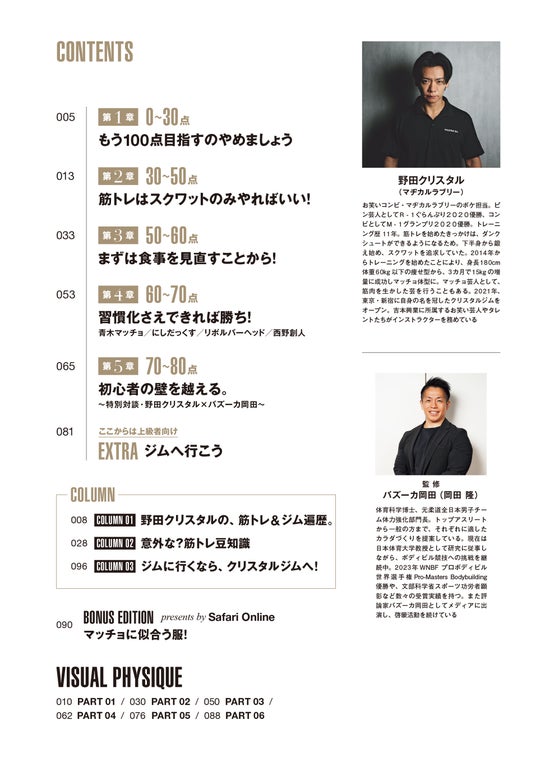 誌面内では日本体育大学教授・岡田 隆氏(バズーカ岡田)とのPFCバランス対談や、青木マッチョ(かけおち)、にしだっくす、リボルバー・ヘッド、西野創人(コロコロチキチキペッパーズ)といったマッチョ芸人たちのルーティンなど、読み応えある実録コンテンツも多数収録。理論×実践×継続が、1冊に詰まっています。