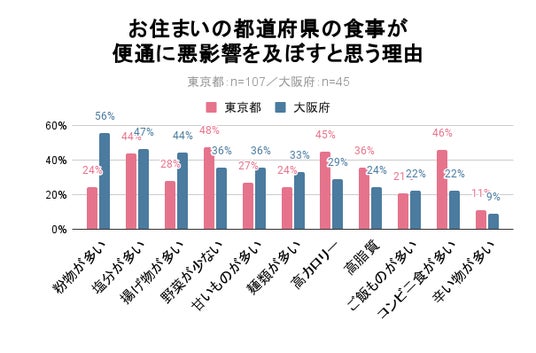 5人に1人が現在住んでいる都道府県の食事の傾向が便通に悪影響を及ぼしていると回答その理由として、東京は「野菜が少ない」「コンビニ食が多い」、大阪は「粉物が多い」「塩分が多い」と回答する人が多数