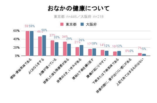 ・また、おなかの健康に関する課題感として最も多かったのが東京・大阪共通で「便秘気味 である」ことだった。次点で割合が高かったのが意外にも「よくおならをする」ことだった。
