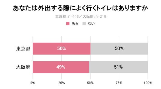 東京と大阪どちらも約半数が、外出の際によく行く「行きつけのトイレ」が存在する