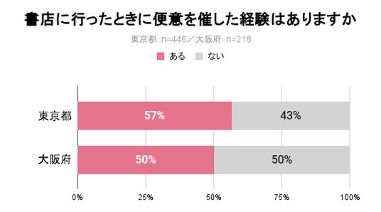書店に行った時に便意を催した経験がある人の割合は、東京の方がやや多いということが分かった