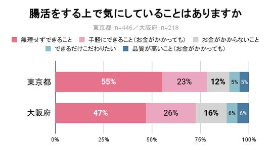腸活をする上で気にしていることとして、東京・大阪どちらも「無理せずにできること」がトップ「手間・お金がかからない」ことに対する意識は大阪の方が高い傾向に実際に、腸活にかけている平均金額は東京の方がやや高い