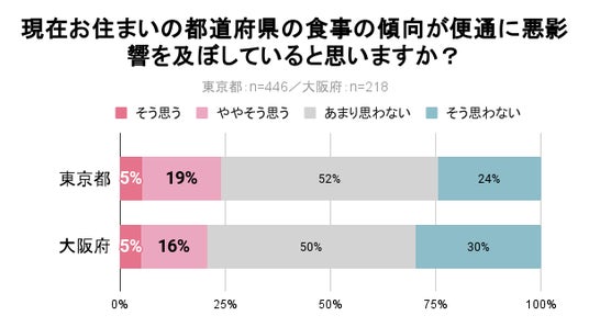 また悪影響を及ぼしていると回答した人の中で、東京は「野菜不足」「コンビニ食の多さ」などが原因と捉えていて、大阪は「粉物が多い」「塩分が多い」「揚げ物が多い」などを挙げています。