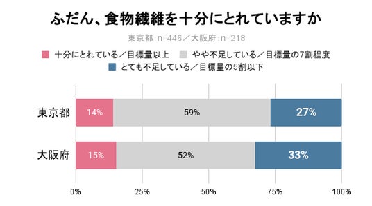 ・食物繊維の摂取においても東京と大阪で大きな差は見られないが、「とても不足している」人の割合は大阪の方が多い結果となった。