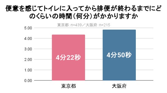 ・また、「トイレに入ってから排便が終わるまでにどのくらいの時間がかかるか」という質問から可視化した排便時間データを取得。1回の排便において大阪府の方が平均約28秒長く時間をかけていることが分かった。