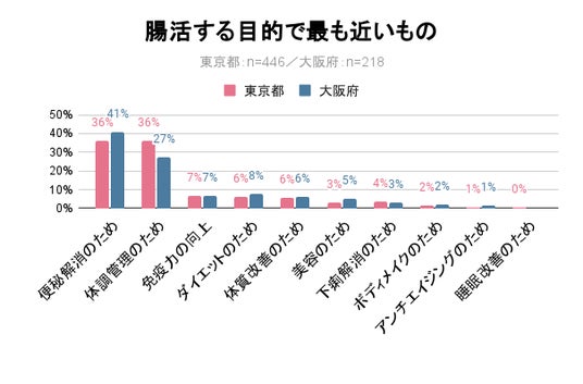 ・腸活の目的として、東京では「便秘解消のため」「体調管理のため」が同率で回答率が最も高い結果となった。