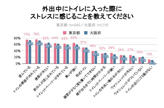 ・外出中にトイレに入った際のストレスとして「混んでいる」「トイレの便座が汚い」などが多く挙げられることから、比較的空いていて、清潔感があるトイレを選んで「行きつけ」にしているのではないかと考えられる。