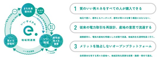 「e.CYCLE」は、再エネに関わる自治体、発電所、小売電気事業者、そして電力消費者をつなぐ再エネアグリケーションプラットフォームで、再エネの“地産地消”や、再エネを産地から他地域に売電する“地域間流通”を可能にします。特長は、電力取引で得た収益の一部を「地域活性化原資」として再エネの産地に還元することです。これにより、再エネ導入の課題とされる、再エネと地域の共生・地域活性化を実現しています。
