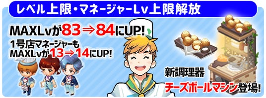 2024年8月日 メンテナンス後より、レベル上限が解放されます。上位レベルのお店のみが導入できる調理器「チーズボールマシン」が新たに登場します。