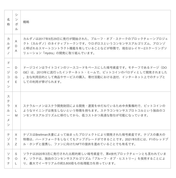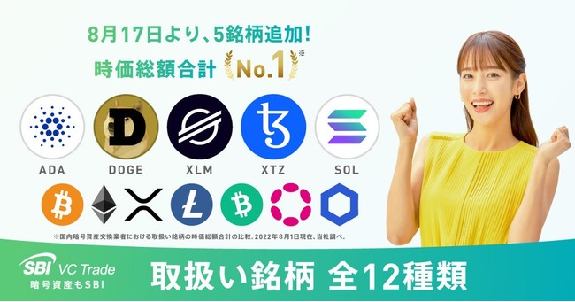 SBIグループにて暗号資産交換業を運営するSBI VCトレード株式会社(本社:東京都港区、代表取締役社長:尾崎 文紀、以下当社)は、2022年8月17日(水)から新たに『カルダノ(ADA)』、『ドージコイン(DOGE)』、『ステラルーメン(XLM)』、『テゾス(XTZ)』、『ソラナ(SOL)』の5銘柄の取扱いを追加し、取扱い暗号資産は全12銘柄となり、取扱い暗号資産の時価総額合計は業界NO.1※となりますのでお知らせいたします。