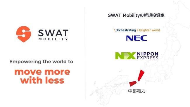 SWAT Mobility Pte. Ltd.(本社:シンガポール、CEO:Jarrold Ong、以下「SWAT」)は、既存投資家である株式会社東京大学エッジキャピタルパートナーズ及び新規投資家である日本電気株式会社、NIPPON EXPRESSホールディングス株式会社、中部電力株式会社を主な引受先とした第三者割当増資による資金調達を完了しましたので、お知らせ致します (金額非公開)。