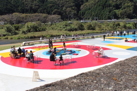 10月5日には、本プロジェクトの完成披露イベントが、久世河川敷(久世河川公園スケートボード広場)にて行われました。真庭市の太田昇市長らが参加するテープカットや、広場を囲んで地元企業のマルシェが並ぶ中でのSUIKO”氏のトークセッションや地域の若者が企画したブレイクダンスプログラムなどが実施。全長100mのDoodle Paper(超巨大お絵描き用紙)では、老若男女が自由に絵を描く機会なども創出され、床面ミューラルアートを通した、地域に活性と新たな文化交流を生み出す場となりました。