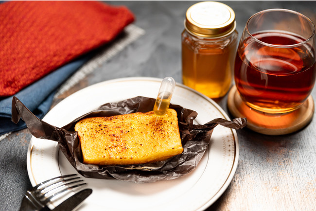 『生』食パンを特製アパレイユ(卵液)にじっくりとつけ込み、外はカリカリ、中はとろとろに仕上げた贅沢な仕上がりです。仕上げにかけて食べるとさらに美味しい付属のはちみつは、湘南みつばち倶楽部の