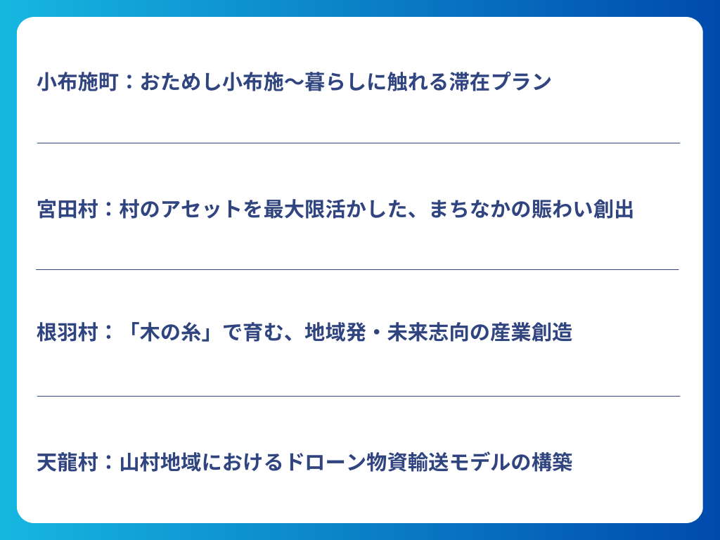 地場産品のマーケティング支援、公共交通分野での実証、六次産業化の推進など、複数分野でプロジェクト化・事業化が進み、現在も多くの取組が継続・発展しています。