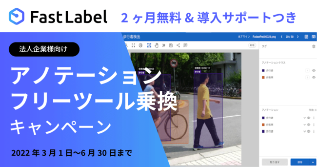 AI革命のインフラを目指すFastLabel株式会社(本社:東京都品川区、代表取締役CEO:上田英介、以下「当社」)は、アノテーション作業においてOSS(オープンソースソフトウェア)などのフリーツールを利用されているエンタープライズの企業向けに、「アノテーションフリーツール乗換キャンペーン」を開始することをお知らせします。