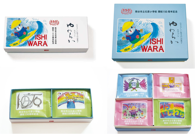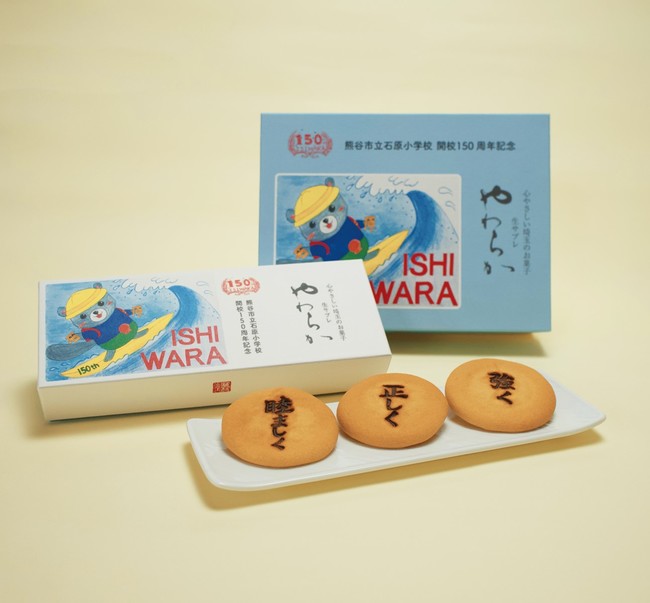 熊谷市立石原小学校の開校150周年を記念し生徒から150周年記念デザインを募集しました。児童達の投票によって選ばれた24作品と校訓書道展から3点をパッケージデザイン・焼印デザインとして商品化。大好評により完売御礼!