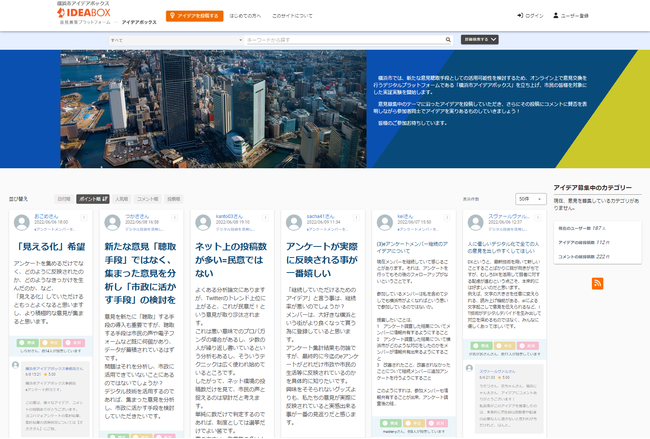株式会社自動処理(東京都中央区、代表取締役:高木 祐介)はアイデアボックス2.0開発を記念し、デジタル庁にも採用されたことで話題の政策検討プラットフォーム『アイデアボックス』を、横浜市に無償貸与・運営しています。