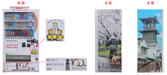 この度、川越市産業観光館の指定管理者である株式会社まちづくり川越が川越市市制施行100周年事業として実施する自動販売機のラッピングに、トーヨーケムのマーキングフィルム「ダイナカルメディア(R)」が採用されました。市内市街地13台のダイドードリンコ株式会社の自動販売機がマーキングフィルムに印刷された市制施行100周年ロゴマークと「時の鐘」などの川越のシンボルで彩られます。