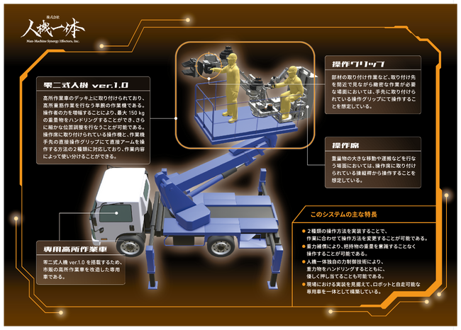 高所作業車のデッキ上に零二式人機 ver.1.0 を設置し、重量物の設置作業等を単独もしくは作業員と共同で行なうことを目的に開発しています。まずは鉄道インフラメンテナンスにおいての活用を考えており、将来的には土木、電力、道路などの高所重作業への汎用な応用を想定しています。