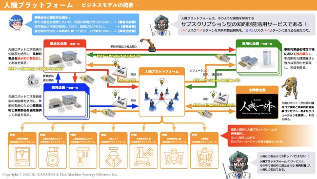 人機プラットフォームは、力学ベースの先端ロボット工学技術に関する知的財産、技術の社会実装に必要な製品コンセプトの企画提案、および試作機開発をパッケージ化して提供する課題解決型サブスクリプションサービスであり、プラットフォーム参画企業である「人機プラットフォーマ」が主体的に研究開発に貢献しつつ、費用および役割を分担してリスク分散することで先端ロボット工学技術の社会実装を可能とする共創ビジネスモデルです。