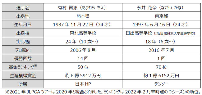 有村選手は、プロ16年目を迎え、米国ツアー出場をはじめとした経験、実績共に豊富な女子プロゴルフ界を代表する選手のひとりです。2021年は賞金総額でランクインを果たし、3年連続でシード権の獲得を果たしました。また、コロナ禍においては女子プロゴルファー有志でSNSのアカウントを立ち上げ、さまざまな企画を通じて女子ゴルフの魅力を発信しています。日本財団選出の「HERO AWARD」受賞に至った「智恵サンタ」も引き続き開催し、積極的な社会貢献活動を継続しています。