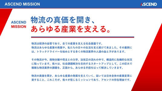 物流の真価を開き、あらゆる産業の発展を支えていく、延いては日本全体の産業変革に資すること。これこそが、我々が信じるミッションであり、アセンドの存在理由です。