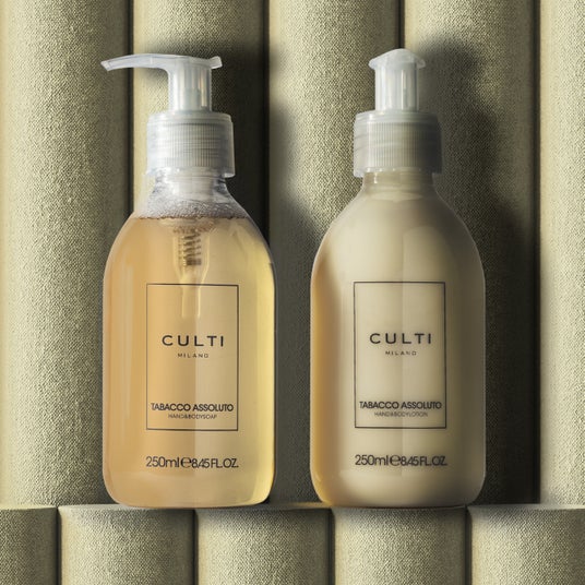 伸びのよいライトなジェルと優しい泡立ち、香りを楽しみながら手肌をさっぱりと洗いあげるハンド&ボディソープ。<250ml 税込4,620円>、手肌の保湿をしながらCULTIの豊かな香りを放つ上質なシルクのようなテクスチャーのハンド&ボディローション。<250ml 税込5,940円>