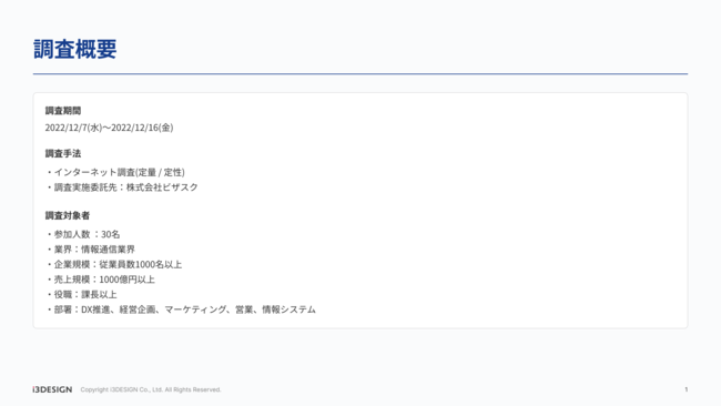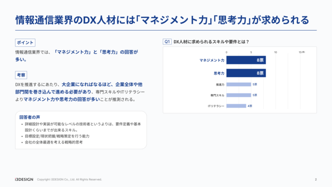 Business x Design x Technologyを融合させたデザインコンサルティングファームである株式会社アイスリーデザイン(本社:東京都渋谷区、代表取締役:芝陽一郎、以下:アイスリーデザイン)は、情報通信業界の役職者を対象に、「DX人材育成の実態調査」を実施して、調査レポートを発刊。本日より無料公開いたします。