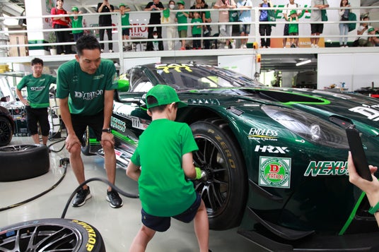 整備体験した車両は、アジア最大の国際チャンピオンシップレース「GTワールドチャレンジ・アジア」に参戦している #777 D’station Vantage GT3 EVO を用意。チームメカニックによる、レースさながらのスピーディーなタイヤ交換を実演披露したほか、お子様にもタイヤ交換体験に挑戦していただきました。