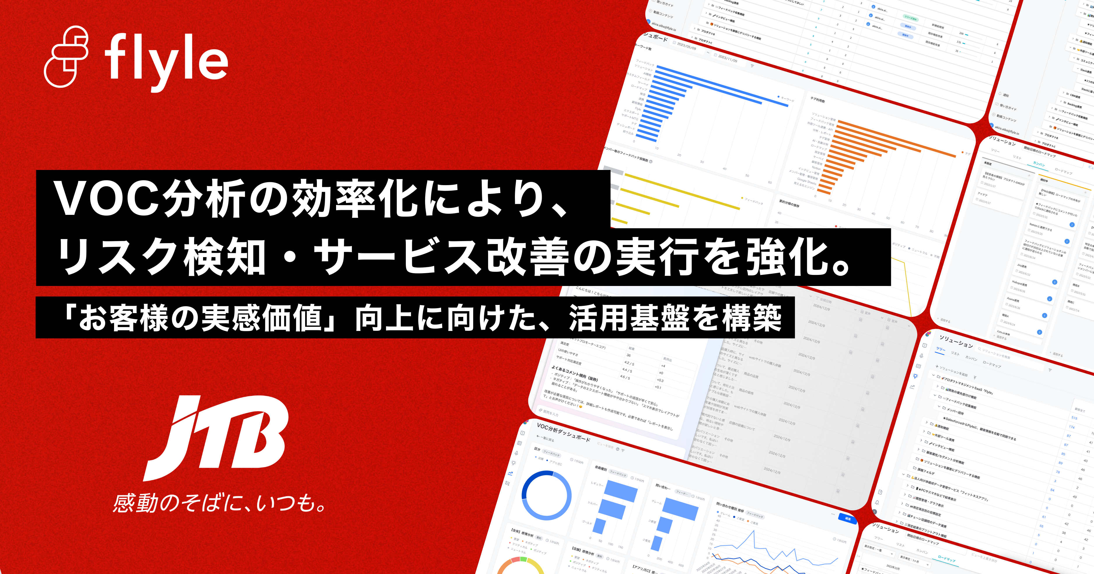 VOC分析の効率化により、リスク検知・サービス改善の実行を強化。「お客様の実感価値」向上に向けた、活用基盤を構築|導入事例ページ:https://flyle.io/jp/usecases/jtb