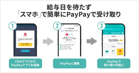 近年、キャッシュレス決済の急速な普及に伴い、給与をデジタルマネーで直接受け取りたいというニーズが高まっています。 これまで『CRIA』は、セブン銀行ATM等との連携により「リアルタイムの現金受取」を強みとしてきましたが、さらなる利便性向上のため、国内最大級の決済プラットフォームである「PayPay」との連携を決定いたしました。