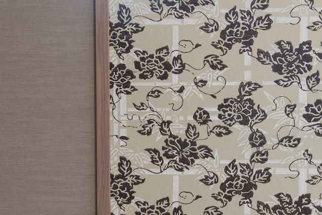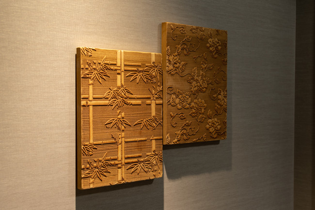 そして、1F廊下には、京からかみの壁紙とその版木をパネルにしたものをアートワークとして展示しています。これらの文様には、各街道からの京都への出入口である京の七口のひとつ「粟田口」に本ホテルが立地することから、粟田口と由縁のある「芙蓉牡丹唐草」(※1)と「中竹」(※2)の2つが選ばれています。