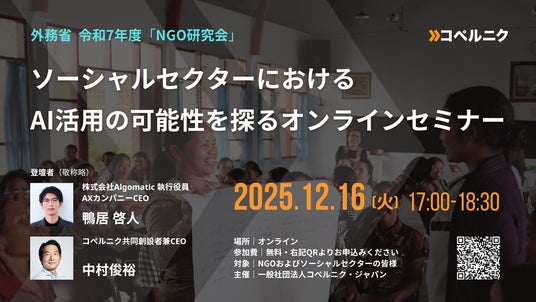 コペルニク・ジャパンは12月16日(火)に、令和7年度NGO研究会(外務省)の調査事業の一環として、NGOおよびソーシャルセクターの皆様に向けて、ソーシャルセクターにおけるAI活用の可能性を探るオンラインセミナーを開催します!