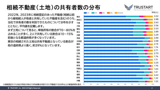 「人とデータで全てを可能にする」というパーパスを掲げる不動産テック企業のTRUSTART株式会社(本社:東京都港区、代表取締役:大江洋治郎、読み:トラスタート)は、相続不動産や遺贈・贈与された不動産の売却傾向について分析した過去2回のレポートに続き、相続された不動産の共有者数に注目した不動産ビッグデータ分析レポート第3回を発表しました。共有者数についての調査結果に加えて、共有者数の多い相続不動産データの活用事例についても記載しており、無料でダウンロードできます。