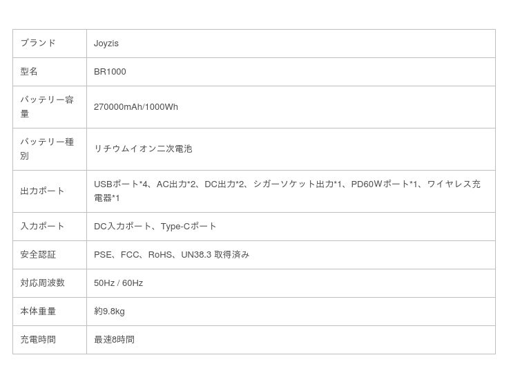 ▼Joyzis ポータブル電源 大容量 BR1000 の仕様ブランド Joyzis