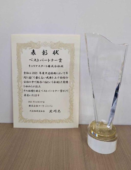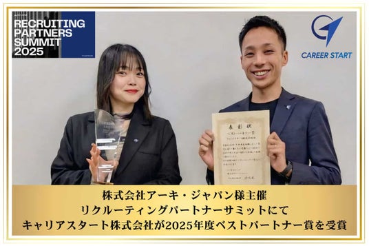 新卒・第二新卒向けの就職・転職支援を行うキャリアスタート株式会社(所在地:東京都港区、代表取締役社長:下山慶一郎)は、2025年12月17日に開催された株式会社アーキ・ジャパン様主催の『リクルーティングパートナーサミット』において、「2025年度ベストパートナー賞」を受賞しました。