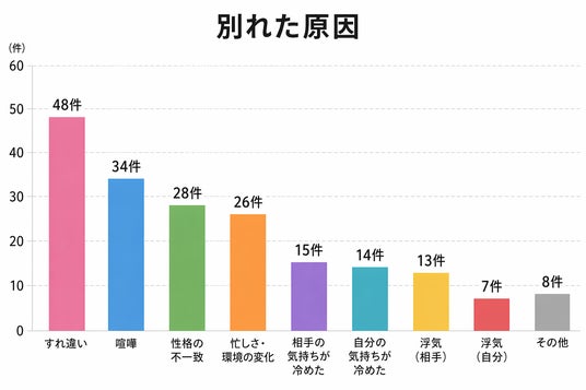 今回の結果で最も多かったのは「すれ違い」(48%)でした。次いで「喧嘩」「性格の不一致」と続いています。なお、本設問は複数回答形式としたため、実際には「すれ違い+忙しさ」「喧嘩+気持ちの変化」など、複合的な要因で別れに至っているケースが多く見られました。単一の原因ではなく、複数の要素が重なって関係が悪化している点が特徴的です。