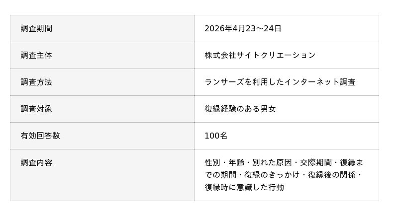 株式会社サイトクリエーションが運営する情報サイト「占いガイダンス」は、復縁の経験者、男女計100名を対象に、アンケート調査を実施しました。