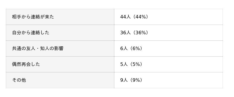 復縁のきっかけ調査では、、「相手から連絡が来た」(44%)の回答が最も多く、次いで「自分から連絡した」(36%)という結果になりました。