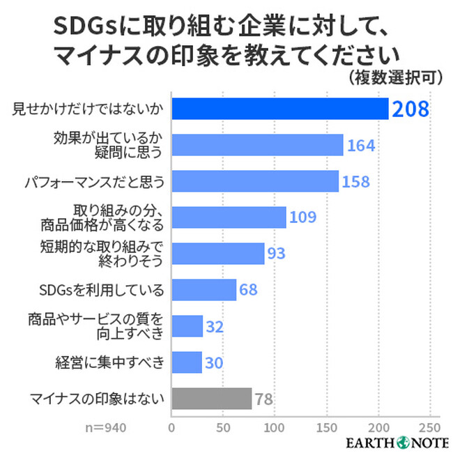 SDGsに取り組む企業へのマイナスの印象は「見せかけだけ」「効果に疑問」「パフォーマンス」