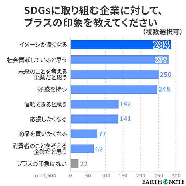 SDGsに取り組む企業へのプラスの印象は「イメージ向上」「社会貢献」「未来を考えている」