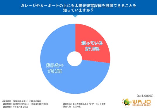 そこで、『ガレージやカーポートの上にも太陽光発電設備を設置できることを知っていますか?』と聞いたところ、「知っている(27.0%)」「知らない(73.0%)」と、こちらもまだ広く認知がされていないという結果になりました。