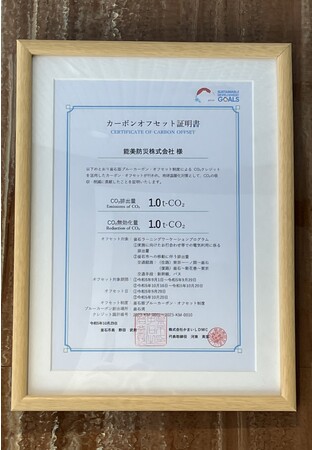 2023年度の「“期待の先”にある安全・防災を考える越境学習」実施にあたって、当社では社員の釜石市への移動等によって排出したCO2量1.0トン分を購入し、釜石市より証明書を受領しました。なお、同証明書は12月より本社受付に掲示しております。