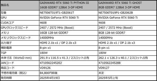 株式会社ニューエックス(本社:東京都千代田区)は、NVIDIA 最新 Blackwell RTX アーキテクチャ採用のNVIDIA(R) GeForce RTX(TM) 5060 Ti GPUを搭載した「GAINWARD RTX 5060 Ti PYTHON III 16GB GDDR7 128bit 3-DP HDMI」および「GAINWARD RTX 5060 Ti GHOST 8GB GDDR7 128bit 3-DP HDMI」の2製品を2025年4月19日(土)より順次発売いたします。