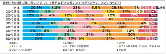 ソーダ割りが定番化。特に男性においては、年齢が上がるほど、ソーダ割りの支持率が高まる傾向に。
