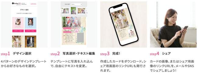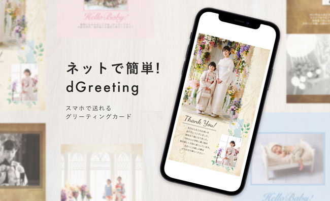 「もっと気軽に年賀状を送りたい」という方に好評なのが、らかんスタジオのdGreeting。これは、らかんスタジオで撮影した写真を使って、オンラインでグリーティングカードを作成・送付できる無料のサービスです。はがきや切手を買いに行ったり印刷したりする手間が省けるだけでなく、普段スマホでやり取りしていて住所を知らない友人・知人にも気軽に送れるのでとっても便利。グリーティングカードを作成すると、シェア用画面のURLが発行されるので、メールやSNSでも簡単にシェアできます。何かと忙しい年末の時期、年賀状作成まで手が回らないという方におすすめです。